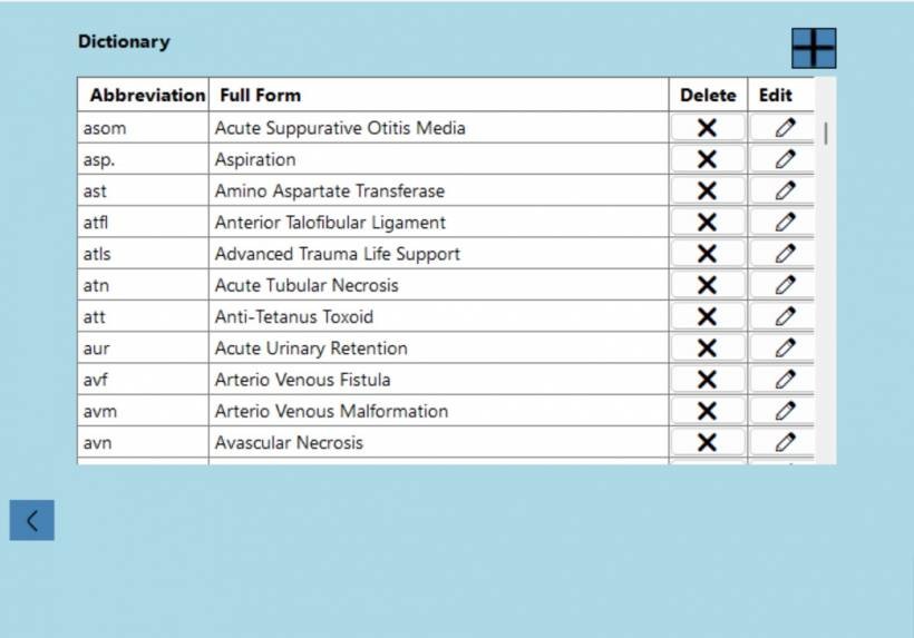 Users or administrators can add new abbreviations, refine existing entries, or remove outdated ones. This ensures the dictionary remains relevant to actual clinical practice, rather than becoming a static list that no longer reflects reality.