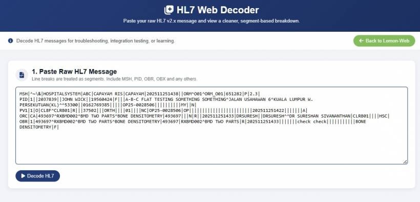 The concept is simple, but extremely useful. You paste an HL7 message into the app, click Decode, and instantly see: