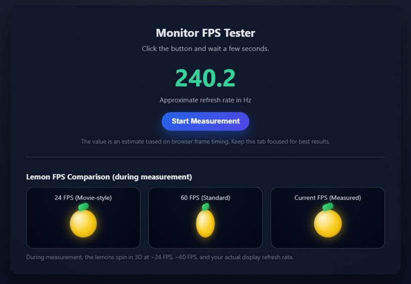 By transforming a complex technical measurement into something visual and effortless, the Monitor FPS Tester gives users immediate insight without forcing them to understand refresh rate theory or hardware terminology.