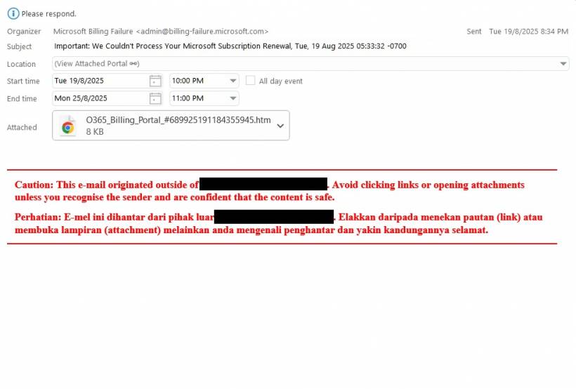 Inside the ICS (calendar) file was a Base64-encoded HTML page named something like O365_Billing_Portal_###.htm. If you clicked it, you didn't get billing information. Instead, you landed on a page carefully crafted to mimic Microsoft's authentication system.