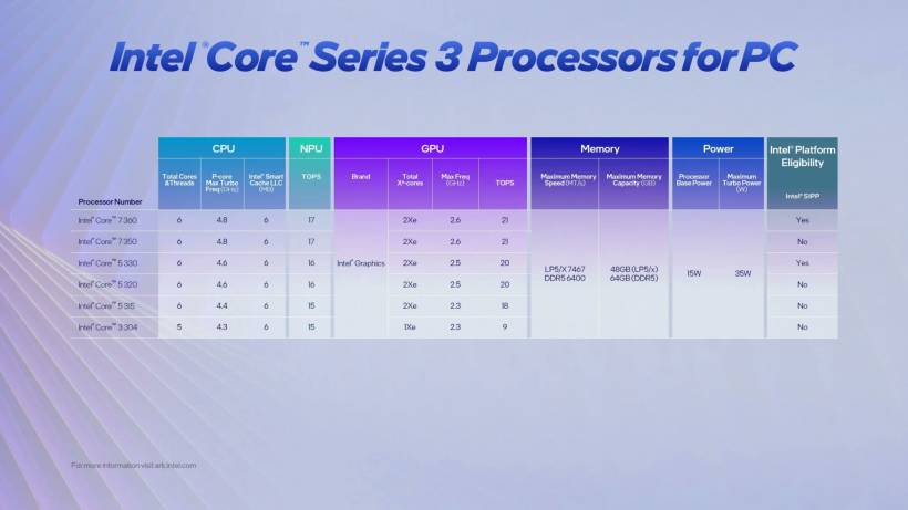 Compared to Panther Lake, these chips come with fewer cores and a simpler structure. Intel has introduced a total of seven models in this lineup, ranging from entry-level options like the Core 3 304 all the way up to the more capable Core 7 360.