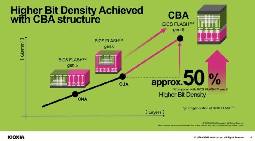 One of the most important upgrades in the BG7 series is the move to Kioxia's BiCS FLASH Generation 8 NAND. This latest NAND generation introduces higher density through a design known as CMOS directly Bonded to Array (CBA). In practical terms, this allows more storage capacity to be packed into the same physical space, helping to reduce manufacturing costs.